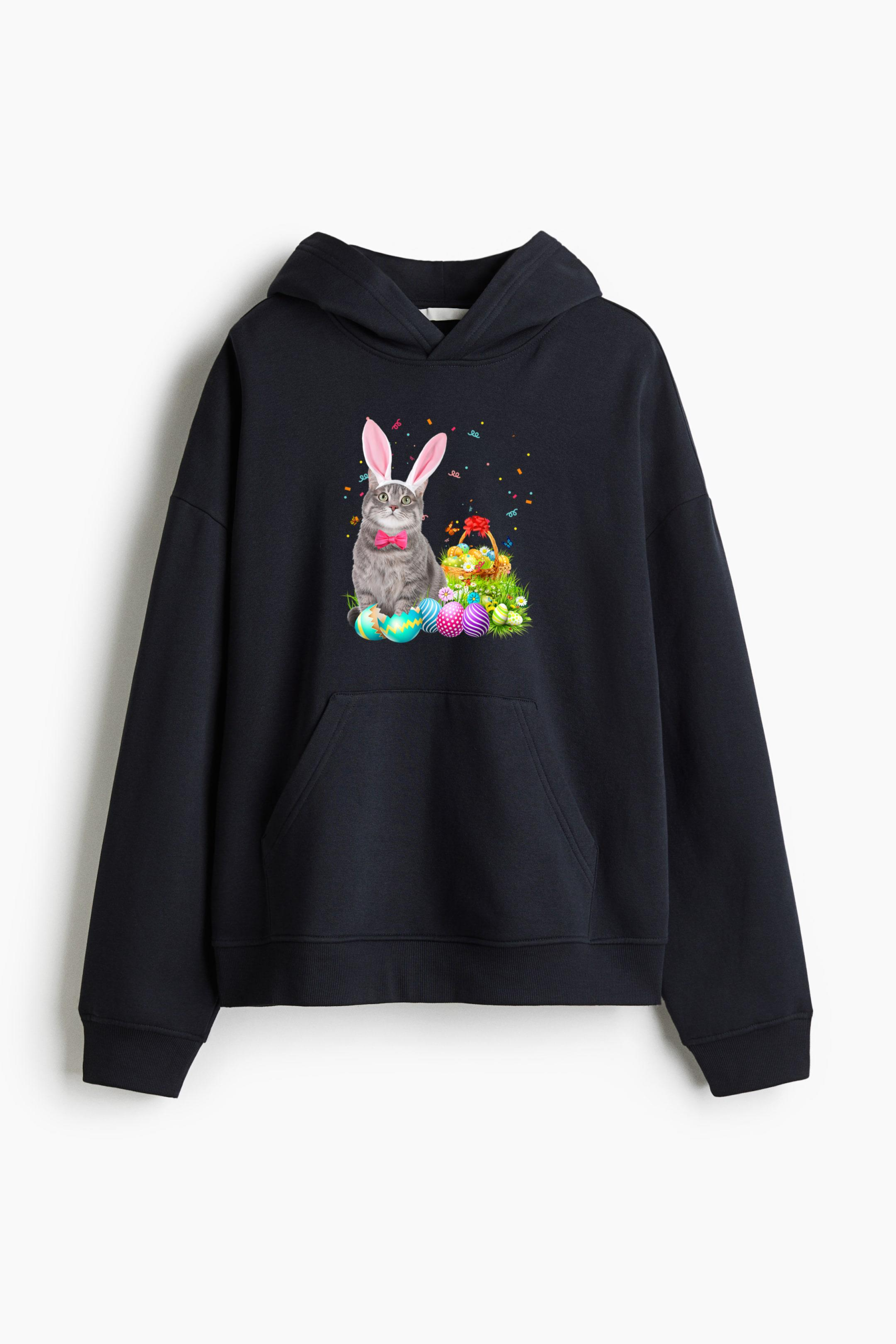 • Happy Easter Cute Bunny Cat Eggs Basket Men Women Funny Gift Loose-Fit Printed Hoodie